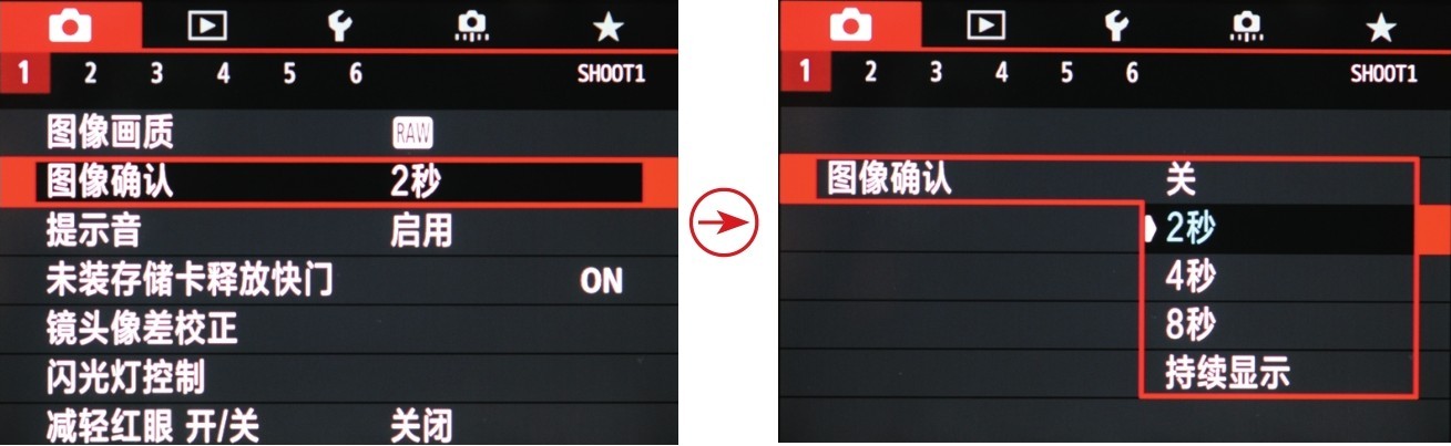 为了方便拍摄后立即查看拍摄结果,可在“图像确认”菜单中设置拍摄后液晶监视器显示图像的时间长度。