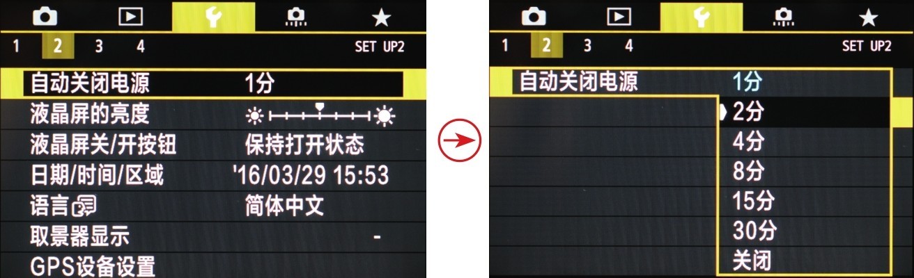 在“自动关闭电源”菜单中可以选择自动关闭电源的时间,在设置完成后,如果不操作相机,那么相机将会在设定的时间自动关闭电源,从而节约电池的电量。
