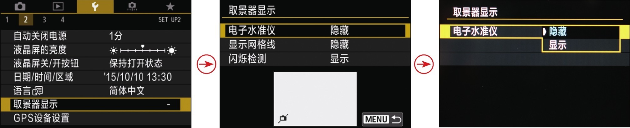 Canon EOS 80D相机的取景器除了可以显示曝光参数外,还可以显示电子水准仪、网格线、闪烁检测3种拍摄信息。在“取景器显示”菜单中,可以设置取景器显示的内容。
