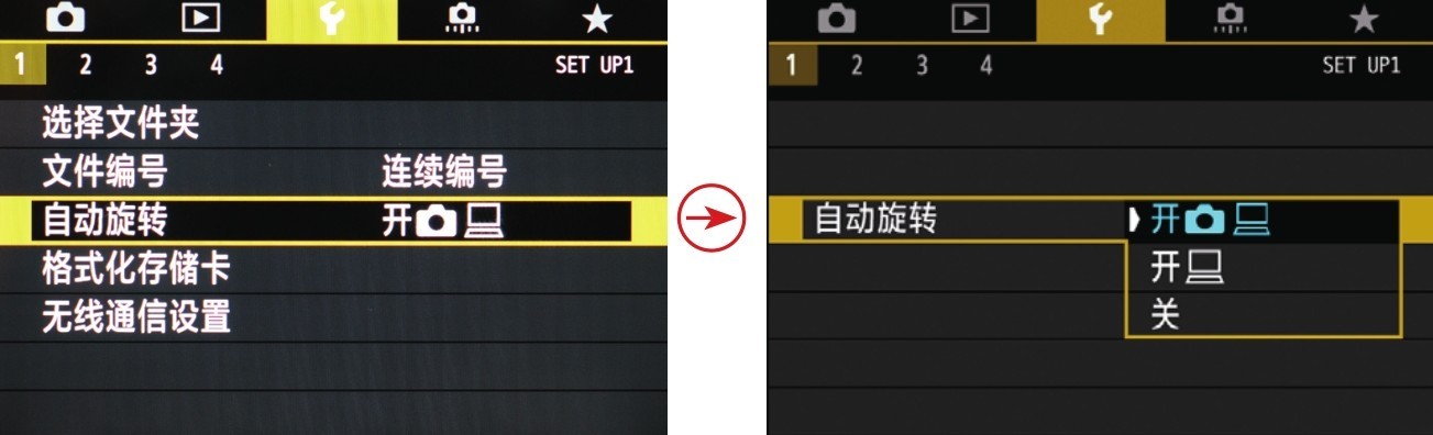 当使用相机竖拍时,可以使用“自动旋转”功能将显示的图像旋转到所需要的方向。