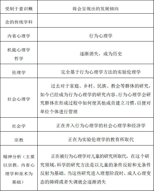 如今,行为心理学能够大胆地向传统心理学家发出挑战:“请向我们展示你们的可靠方法,请向我们表明你们的合理主题,请为我们提供一个围绕你们建立起来的、能够真正促进发展中的学生思想的哲学和社会科学。”