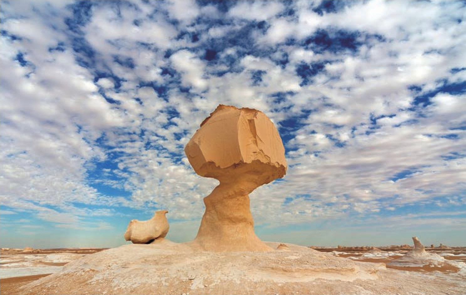 白色沙漠是西部沙漠的又一特色。在费拉菲拉东北20千米处,黄沙掩不住越来越多的白色岩石——白垩,它们有的耸入云霄,有的如蘑菇一般静静守候,奇形怪状,不一而足。当阳光洒在它们的身上,这些白色的小家伙们,会变得五彩斑斓,实在像极了画家笔下的油画作品,绚丽多姿。