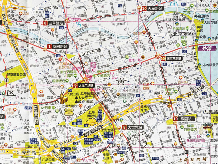 1997年,上海市政府撤出原汇丰银行大楼,上海浦东发展银行通过置换购得该大楼的使用权。上海市政府迁至人民广场,办公地址位于黄浦区南京东路街道的人民大道200号人民大厦,这里成为上海全市的行政中心。图1-29为南京东路街区,选自“上海地图·大城区详图”(由上海市测绘院编制,上海科学普及出版社2012年版)。