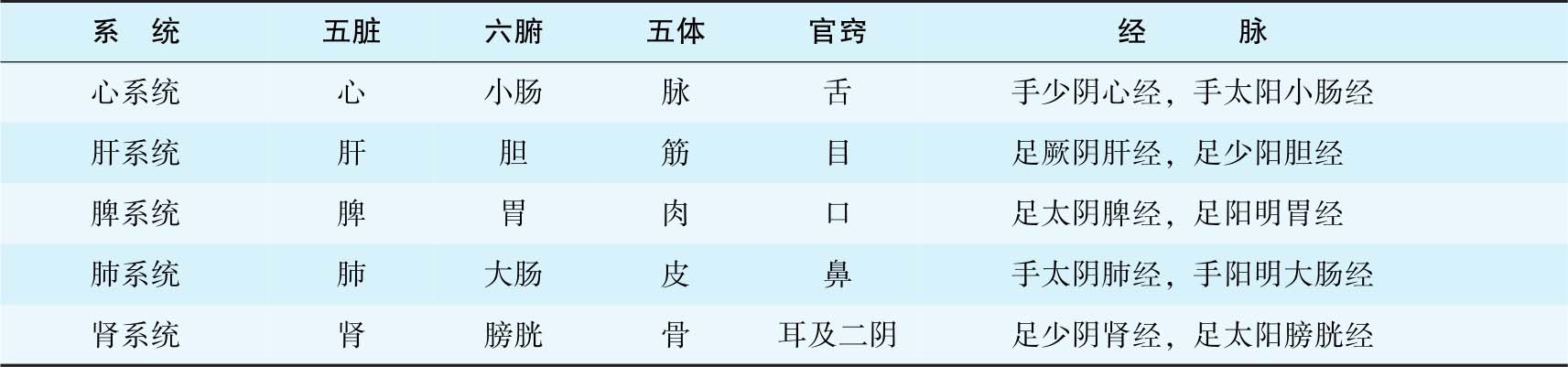 五脏一体观:人体由五脏(心、肝、脾、肺、肾)、六腑(胆、胃、小肠、大肠、膀胱、三焦)、形体(筋、脉、肉、皮、骨)、官窍(目、舌、口、鼻、耳、前阴、后阴)等构成。人体以五脏为中心,配合六腑、形体、官窍,通过经络系统的联络作用,构成了心、肝、脾、肺、肾五个生理系统。心、肝、脾、肺、肾五个生理系统之间,具有结构的联系性和功能的统一性,相互促进,相互制约,共同维持生命活动的正常进行。这种以五脏为中心的结构与功能相统一的观点,称为“五脏一体观”(表0-1)。