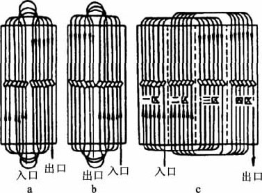 (3)套耕法:采用外翻法或内翻法耕地时,机组在地头转弯较多,操作不便,空行程多,耕作效率不高。大块地采用套耕法可以避免转弯,便于操作,减少地头宽度,提高作业质量和效率。套耕法是把耕地划为4个小区,机组先由第一小区右侧入犁,从第三小区左侧回犁,采用内翻法耕完第一、第三小区,然后再用内翻法绕第三小区耕完第二、第四小区(图2-11c)。