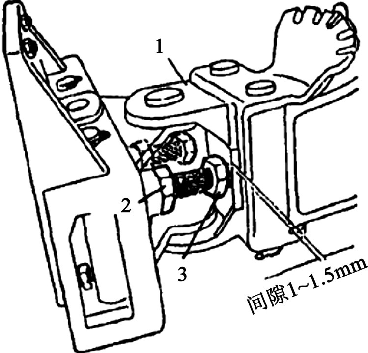 3. 机组直线行驶性调节 当机组进行犁耕作业时,一般情况下左右调节螺钉与连接头间的间隙为1~1.5mm(图2-9)。间隙过小或过大均不合适。但当耕第一犁和第二犁时,或是耕有些弯曲的带状田时,为随时可以修正耕作方向,可将这个间隙适当放大。正常耕作时,实际上应把机组调节得有略向左偏走(未耕地一边)的趋势,这样拖拉机的右轮在犁沟行走时能贴着沟墙前进,既不会爬上沟墙,也不会向已耕地偏走,保持直线行走。当发现机组向右偏行,应调长右边调节螺钉(间隙减小),相应地缩短左边调节螺钉(间隙变大);当发现机组向左偏行,应调长左边调节螺钉,缩短右边调节螺钉。调节方法是:松开调节螺钉上的锁紧螺母,再转动调节螺钉,调节合适后,再拧定锁紧螺母。