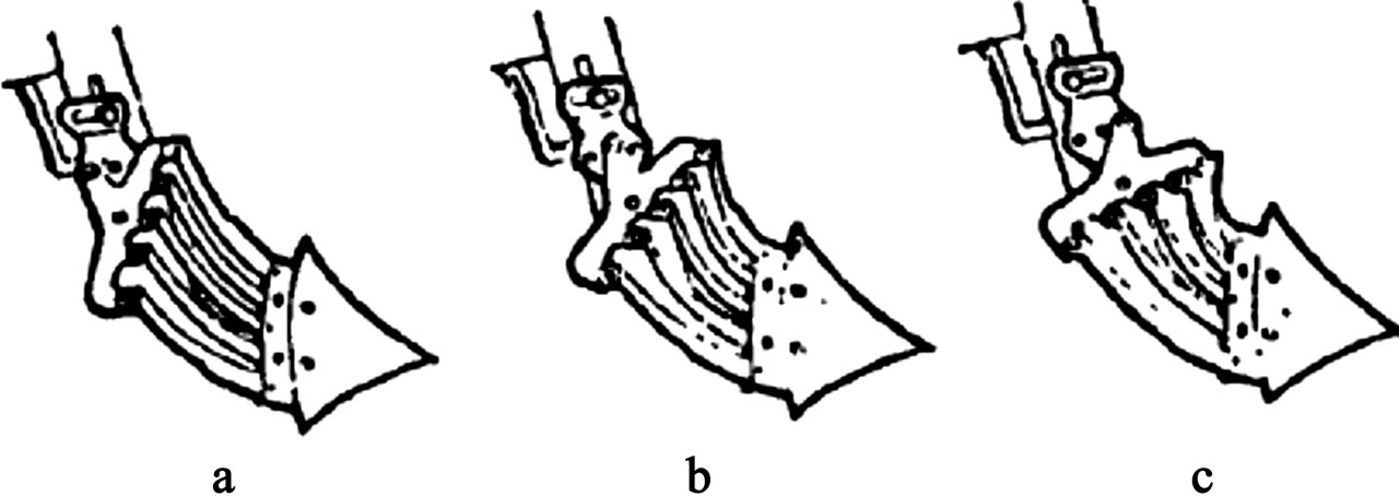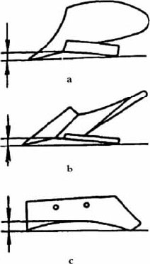 (3)固定螺钉处于最右端,插销在最左边孔中(图2-10c),这时犁体曲面呈翻堡型,曲面扭曲大,翻土性能好,有利于覆盖绿肥、杂面。这种犁体曲面较适合于种植绿草的果园中耕地。