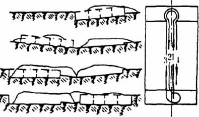 耕第一犁叫做开墒。开墒的好坏对作业质量和效率有很大的影响。开墒时拖拉机要走得慢一些,精力集中看标杆,要走正走直。如果开墒弯曲不直,就会引起耕地宽幅不一致,或者留下三角形地块,造成许多麻烦。开墒前,要将第一犁调浅约半个耕深,如果需要耕后地形成中间高的垄形地,采用外翻法开墒要选在垄脊处;采用内翻法开墒要选在垄沟处。如果希望耕后地块平整,应采用双开墒法(图2-13),即从地块中心用外翻法向两边各耕一犁,然后再用内翻法重耕一犁来填平中间的墒沟,以后继续用内翻法耕地。用该法耕地后不漏耕,地表平整,缺点是开墒处作物的残茬和杂草显得较多。