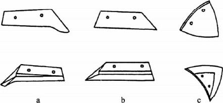 1. 犁铧 犁铧又称犁铲,其主要作用是入土和切土,并将土堡抬起引向犁壁。犁铧由铧尖、铧翼、铧刃和胫刃等部分组成。工作时,铧尖首先入土,然后胫刃从垂直方向切土并形成沟墙,铧刃从水平方向切土并形成沟底,犁铧把切出的土壤抬开至犁壁。犁铧所承受的土壤阻力约为犁体阻力的一半,极易磨损。犁铧有梯形、凿形和三角形三种(图2-5)。