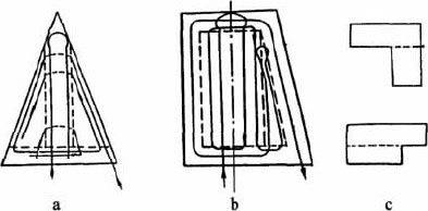 ①三角形地耕法(图2-12a)。一般采用外翻法,耕前应在三角形的中线两侧留出回转地带,在回转地带两侧插上标杆。机组先从右边入犁,耕到回转地带起犁,再转到左边落犁,最后耕中间剩下的回转地带和底边的地头。该耕法在中间有墒沟,要注意收墒。