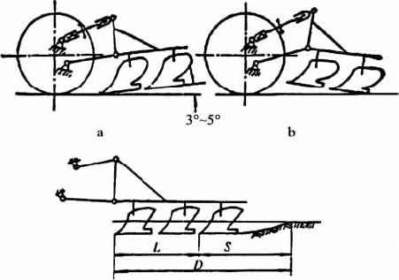 6. 正位调整 正位调整的目的是保持犁体正向前进。如果在工作中犁体偏斜前进,造成阻力增加,耕作质量恶化时,就应进行正位调节,犁的正位调节应根据犁体偏斜的原因来进行。如果是由于牵引线过于偏斜,应适当改变牵引线的方向,以改善犁的工作状况。如果是因为土壤过于松软,犁侧板压入沟墙过深而造成偏牵引,就应加长犁侧板以增加犁侧板和沟墙的接触面积,或在犁侧板与犁托间放置垫片,以增大犁侧板与前进方向的偏角,使犁体走正。