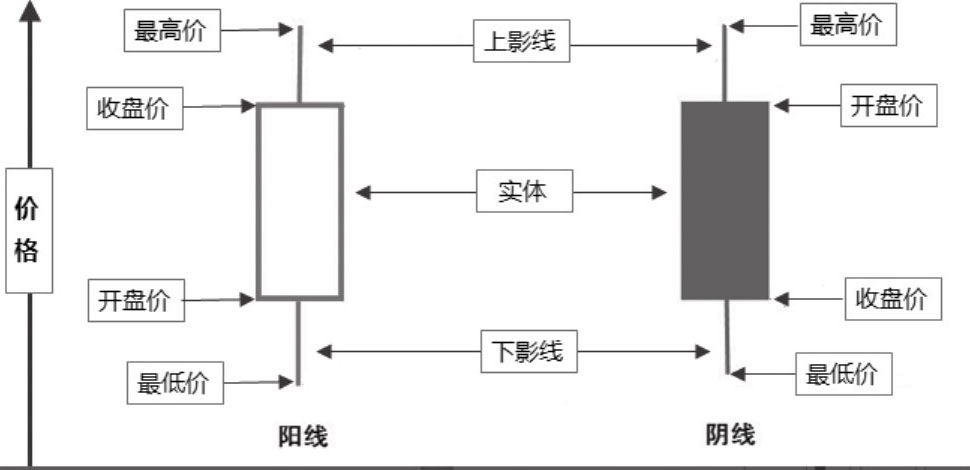 对于阳线或阴线来说,开盘价与收盘价之间的矩形部分称之为实体,实体上方的为上影线,下方的为下影线。
