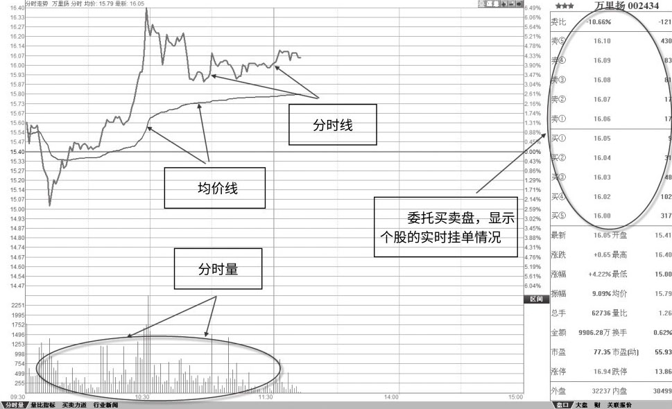 如图1-4 万里扬2016年12月13日分时图,图中的左侧为个股的实时走势图,它包括分时线、均价线、分时量,图中右侧显示个股的挂单情况、成交细节等内容。