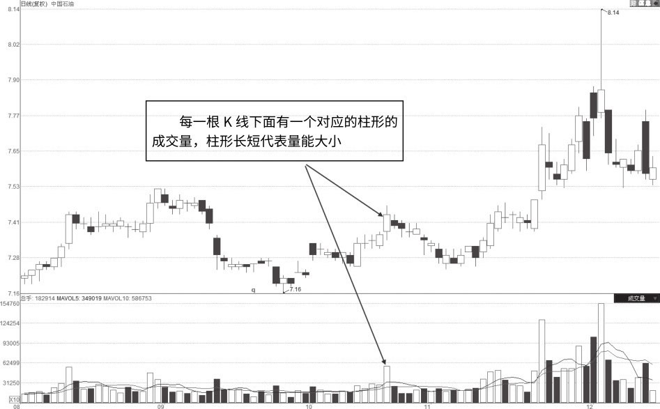 如图1-3 中国石油日K线图,每一根K线代表着一个交易日的价格波动,下方有相对应的柱形成交量,柱形长短代表着成交量的大小,通过小键盘区的上下方向键,我们可以放大或缩小其显示的时间范围,通过键盘上的功能键F5,我们可以在此股的日K线走势图与当日的盘中分时图之间来回切换。
