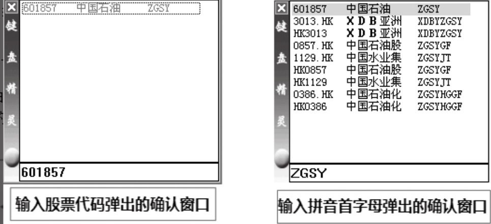 一、直接输入它的代码“601857”,如图1-2所示,会弹出一个相对应的确认窗口,用键盘的上、下键,进行选择,并单击回车,即可打开。