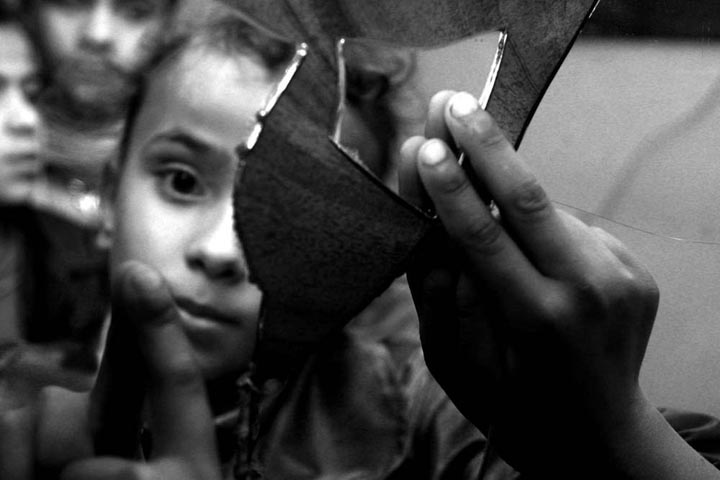 /一个巴勒斯坦女孩在被轰炸震碎的镜子前