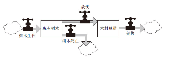 一片森林中所有树木的蓄积量也是一个存量,流入量是树木的生长,流出量包括树木的自然死亡和伐木工的砍伐。被砍伐的木材累积起来,会形成另外一个存量,即伐木工厂里木材的存货量;而当木材出售给客户时,就会产生一个流出量,减少库存(如图1—4所示)。