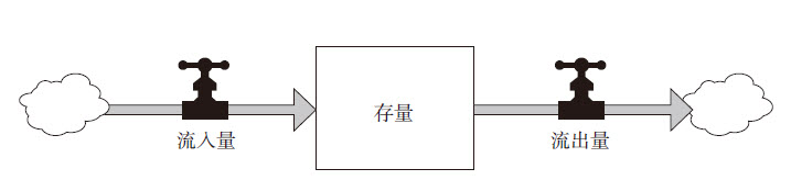 在本书中,存量用方框来表示,流量则用流入或流出存量的、带箭头的水管来表示。在每个流量上标有一个T型图案,代表“水龙头”,表示流量可以被调高或调低、打开或关闭;在流量的前端或后端,有时会画一个“云朵”图案,表示该流量的资源和消耗,也就是该流量从哪里来、到哪里去。虽然我们可以进一步明确这些来源和去处,但这样会把我们对当前系统的分析变得过于庞杂。因此,出于简化当前讨论的需要,我们可以把这些因素用“云”来概略地表示。