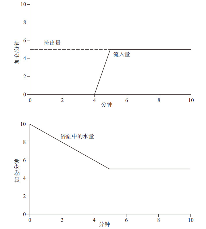图1—7 水持续流入、流出5分钟的情况,以及浴缸中水量变化的结果