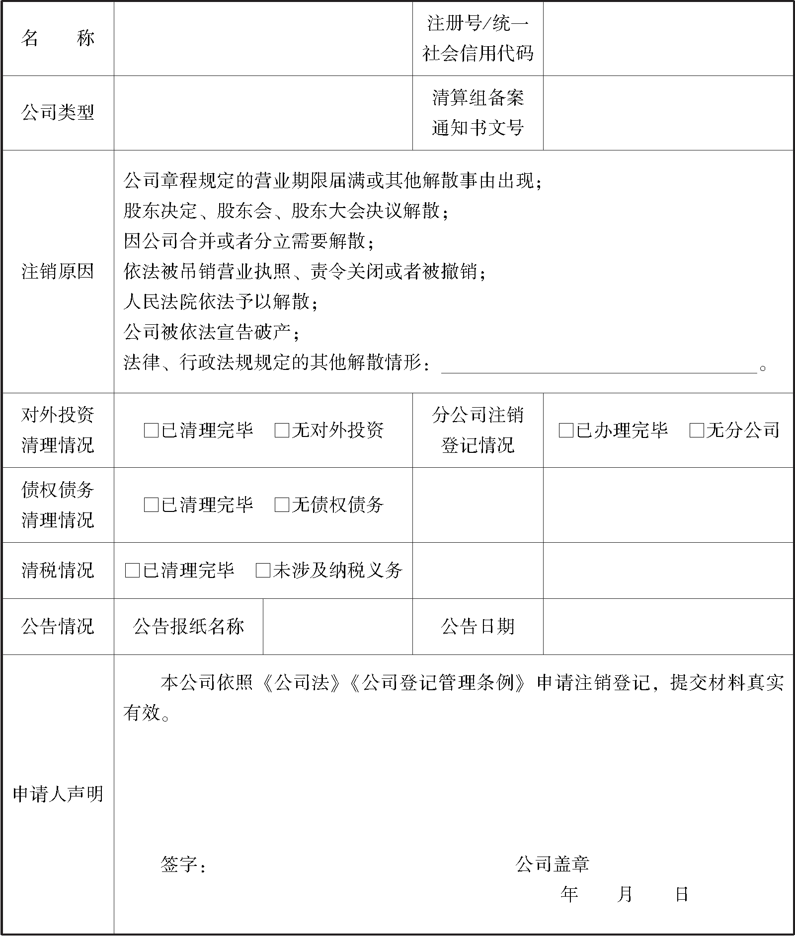 1.本申请书适用于有限责任公司、股份有限公司向公司登记机关申请注销登记。