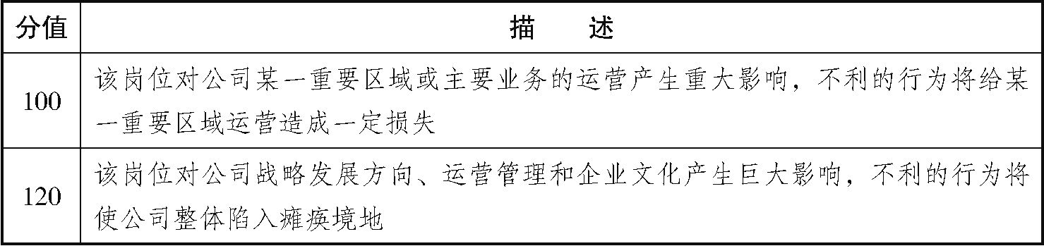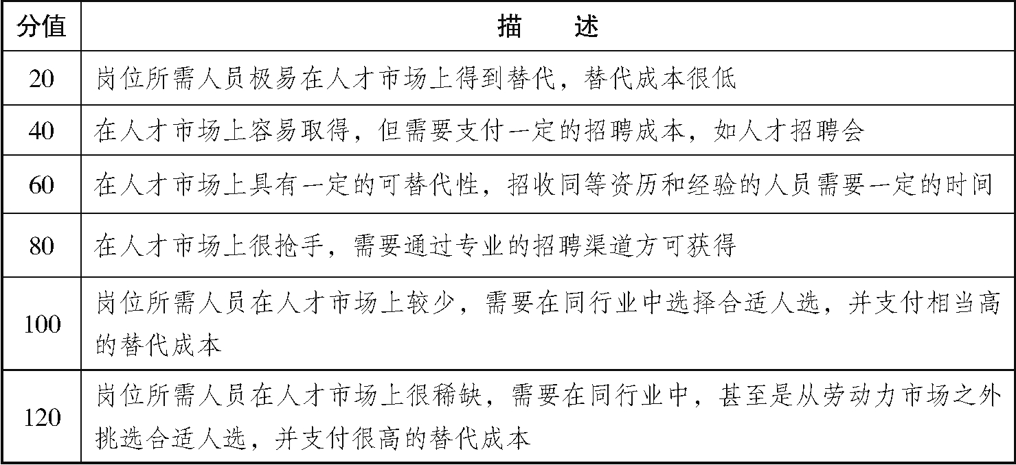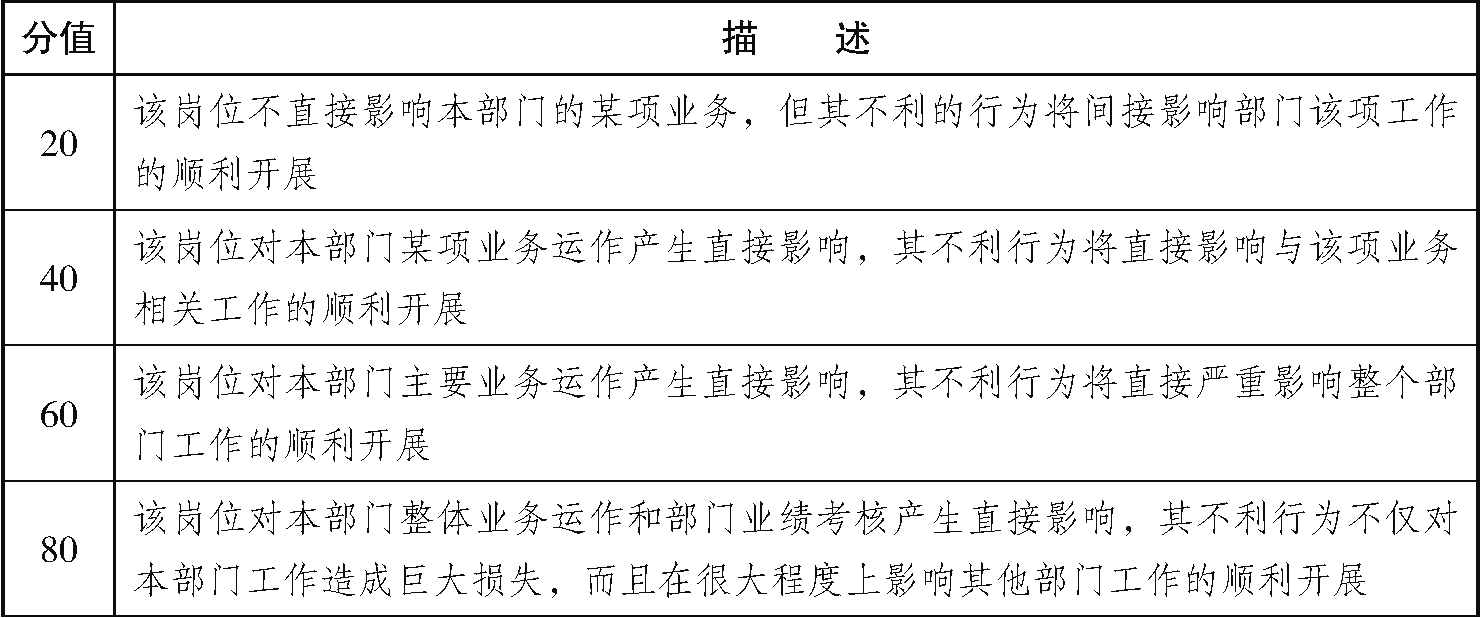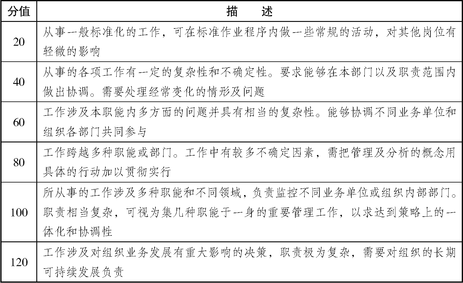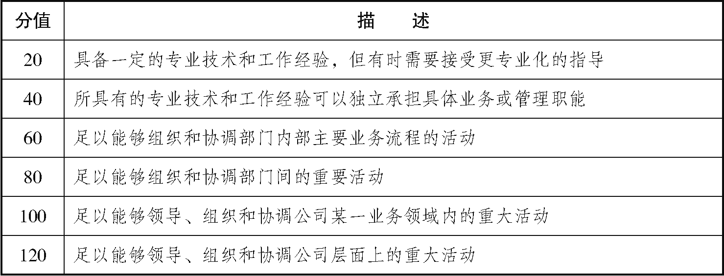 (2)评估时先分别对这四个要素进行每个等级的描述,等级难度由易到难划分为六个等级(20、40、60、80、100、120)。将职位说明书上的内容与等级描述相对照,来确定每个要素的等级及分数。