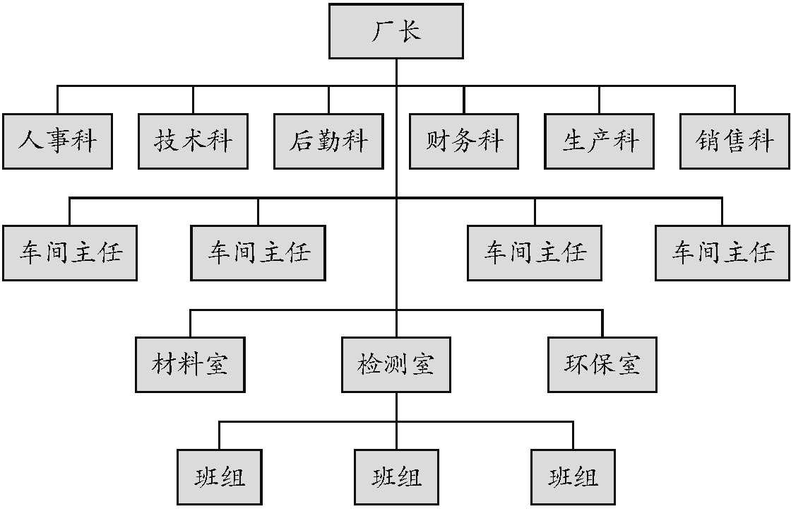 以直线制结构为基础,在厂长(经理)领导下设置相应的职能部门,实行厂长(经理)统一指挥与职能部门参谋、指导相结合的组织结构形式,如图1-2所示。
