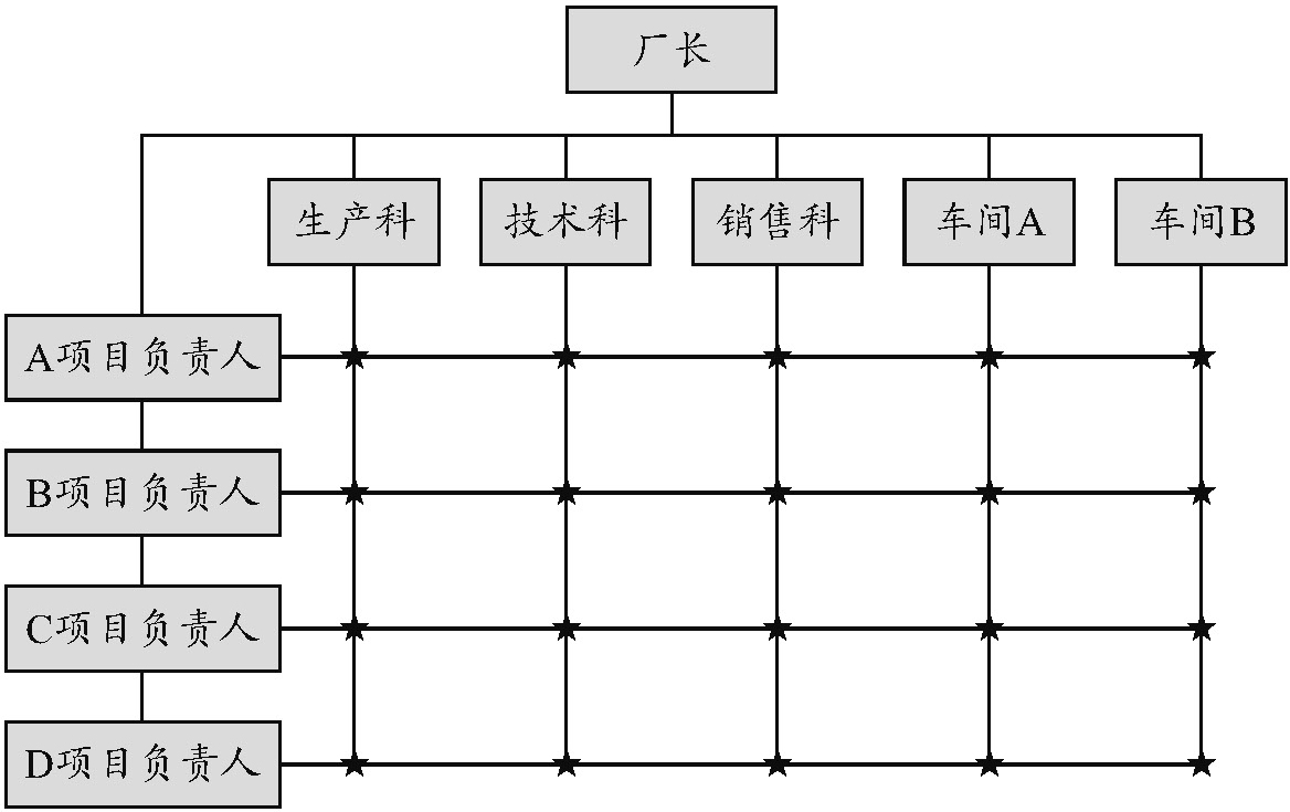 矩阵制结构由职能部门和为完成某一临时任务而组建的项目小组系列组成,它的最大特点在于具有双道命令系统,如图1-4所示。