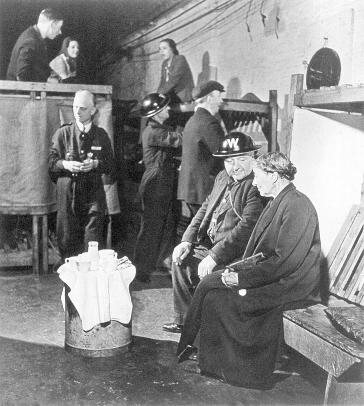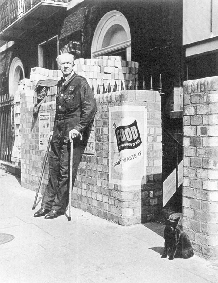 防空队员约翰·布拉姆利在兰贝斯区(Lambeth)防空洞2号哨站岗,伦敦大轰炸期间,他每日24小时执勤