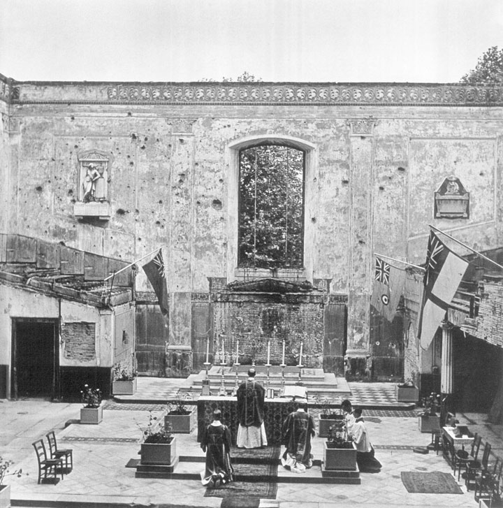 哈钦森神父在炸毁的圣约翰教堂做弥撒