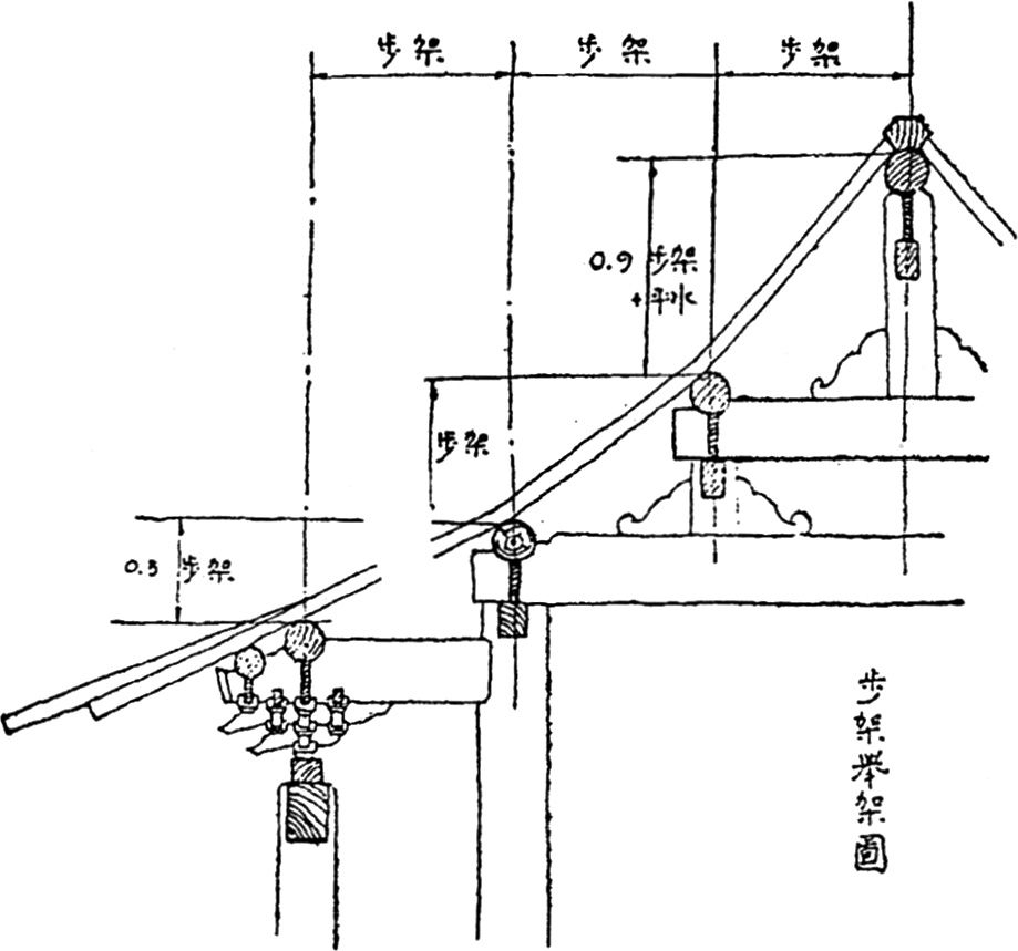这斜度之由来是依着梁架叠层的加高,这制度称做“举架法”。这举架的原则极其明显,举架的定例也极其简单,只是叠次将梁架上瓜柱增高,尤其是要脊瓜柱特别高。