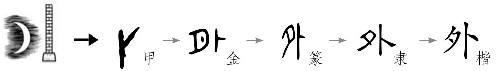 其甲骨文字形借用“卜”,表示“外”与“占卜”的关系。金文加“夕”,夕即月亮,借代星夜,表示在星夜占卜。“外”的造字本义是在星夜的郊野占星问卜。篆文承续金文字形。“外”后引申为郊野、室外的意思,如“野外”,后进一步引申为与“内”相对的方位,如“外强中干”。