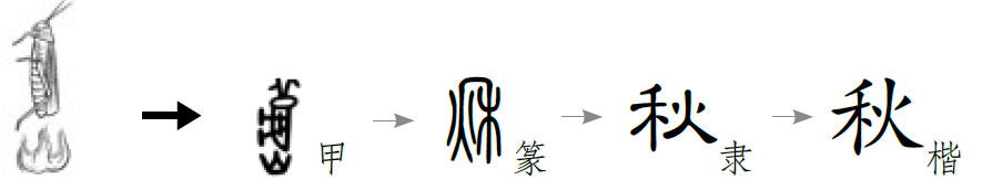 “秋”是个会意字,本义是成熟的庄稼。甲骨文的“秋”,字形就像一只蟋蟀。古人发现蟋蟀一般在秋天鸣叫,所以就借此表达“秋天”的概念。蟋蟀的下方有个“火”字,表示秋天收获谷物之后,用火焚烧秸秆,顺便灭除害虫。现在,“秋”也引申为一年的时光,如“一日不见,如隔三秋”。