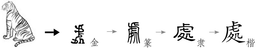 “处”字本义是居住,古代写为“處”。金文字形上方就像是一只蹲坐着的老虎,下方的“几”字,代表虎爪。“处”后来引申为靠着坐具休息,古时常常用来指隐身世外高人的住所。现在平常百姓“蜗居”的地方,也可以称为住处。