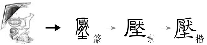 从篆文字形看,上面是“厭”。“猒”是“厭”的本字,“猒”字的金文字形的左边像动物的头、口和利齿,借代虎熊等大型猛兽;右边是“犬”,表示猎捕,合起来意思是捕获大型猛兽,后引申成过多的意思。下面的“土”表示墙体,“压”的意思就是一物压在另一物体上,向下施力,如“压力”“施压”等。