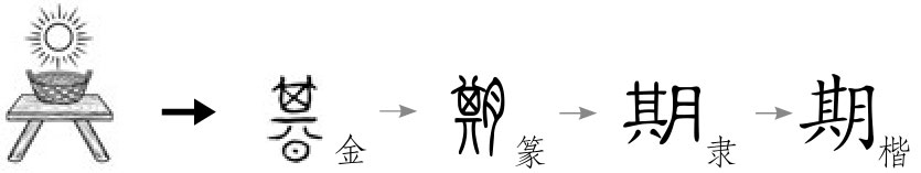 “期”是个形声字,本义是预定的时间。金文的“期”,上方的“其”是声旁;下方的“日”是形旁,代表和时间相关。小篆的“期”,将“日”换成了“月”,字义没有变化。“期”后来引申为约会,如“佳期”。现代汉语中,“期”也表示盼望、希望,如“期许”“期冀”“期望”等。