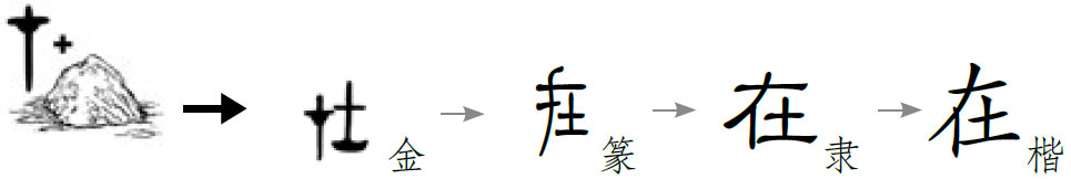 “在”的本义是生存、存在,表示小草从土里刚刚长出来的状态。从小篆字形来看,它是一个形声字,字形左边的“才”是声旁,右边的“土”是形旁。商代卜辞中,也常常将“在”写成“才”。后来,该字又引申为居住、处在。后来,经过词性变化,还用来表示时间、地点,如“正在”“所在”。