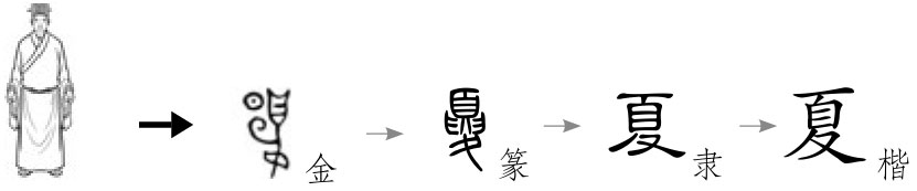 “夏”字本义为人。在金文中,“夏”字为一个人形,头部在上边,躯干在中间,手在两侧,足在下边。在小篆文中,字形又发生了一些变化,金文中的身躯不见了,只有一只大脚。古代中国被称为“华夏”。我国历史上第一个王朝,即为夏朝。后来,“夏”字被假借为夏季,用来表示一年之中的第二个季节。