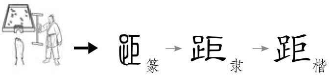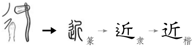 “近”字本义为距离短。在小篆文中,其字形左边为“辵”(上方代表路,表明其与行走有关;下方为一只脚的形状),右边为“斤”,看上去像一把砍伐树木的斧子。砍树时,斧子离树木的距离要近一些,很好地表现了字的本义。现在,“近”还指时间上的不长久,如“近来”;而两个人的关系亲密,也称为“亲近”。