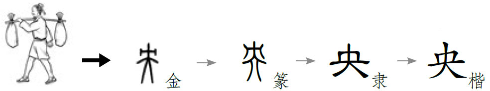 “央”字本义为中间,是一个会意字。它的金文字形,就像一个人的肩头挑着担子,两边各绑着一捆木柴。“央”是说这个人相对于担子和木柴的位置,正好处在中央,如《诗经·秦风·蒹葭》中“宛在水中央”。“央”还可用来代表时空距离上的广大。另外,该字还有无穷无尽之义。“央”还可用作动词,意思是请求,如“央求”。