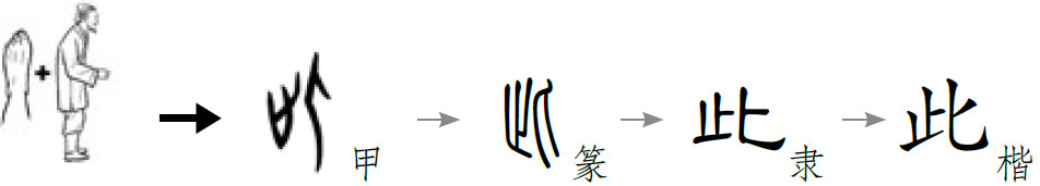从甲骨文字形上来看,这个字的左边是“止”,代表脚;右边是一个人形。整个字形表示的是人站立的处所——“这”“这里”“此地”,这就是“此”的本义,它是一个代词。这个字还有如此、这般的意思。