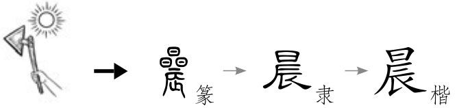 “晨”字本义是指房宿星,是农民早起耕作的时间参考。字形采用“晶”作形旁,“辰”作声旁。太阳西沉为“昏”,太阳落山为“暮”,月亮初升为“夕”,月高人静为“夜”,安定入宿为“冥”,晨光微露为“曙”,太阳升高为“晓”,月尽日出为“朝”,日浴草木为“早”,荷锄出工为“晨”。现代汉语中,“晨”就是指早上。