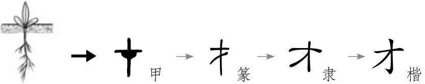 从甲骨文的字形来看,这个字上面是一横,代表地面;下面是正在萌发的草木嫩芽。因此,“才”的本义就是草木初生。“才”是“材”的通假字,意为材资、本能。现在这个字一般解释为才能、本领。木有用叫作“材”,物有用叫作“财”,人有用叫作“才”。