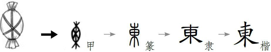 “东”由“日”和“木”组合而成,表示太阳刚刚升起,还没有升到树梢的高度。“东”也指“橐”,是一种两头开口的袋子,将东西装在袋子里后,再用绳子将其两头捆紧。后来,“东”字表示太阳升起的方向,与“西”相对。古代主人位子在东,宾客位子在西,所以该字引申为主人,如现在也有“房东”“股东”等说法。