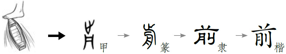 “前”原写作“歬”,它的字形上边是一只脚的形状,下边为一只舟,意思是船在前进。随着汉字的演化,“舟”变成了“月”,“止”变成了“