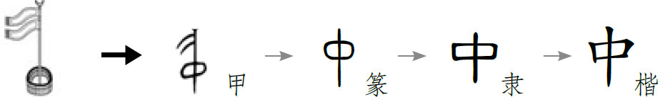 甲骨文的“中”字,字形下方有一个圆圈,代表一圈围起来的栅栏。上方两条弯曲的折线,代表迎风招展的旗帜;一条竖线从上而下贯穿圆形,代表旗杆正好插在栅栏的正中央,形象化地展现了“中”的本义,即中间、中央。“中”还读zhóng,如“中奖”“中计”。