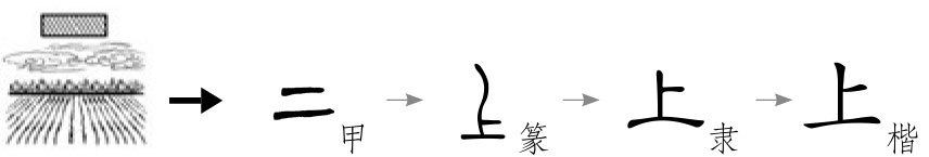 “上”是个指事字,本义是高处、上部。甲骨文中的“上”,字形下部的长横,代表地平线;上部较短的横画,是指事符号,表示位于上方。小篆中“上”的字形,为了和“二”字相互区分,又在中间加了一条竖画。在古代,“上”还用来表示地位高的人或事物。