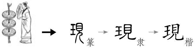 从“现”字篆书字形看,左边是“王”,即玉;右边是“见”,意思是睁着眼睛看。“现”就表示宝玉显露光泽让人看见,引申为显露、眼前的,相关用词有“发现”“表现”“现在”“现实”等。《正韵》解释为“显也,露也”,《集韵》解释为“玉光”。