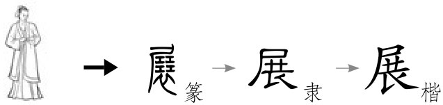 “展”表示解开衣扣。古代的上装一侧有一排用布带做的扣孔,另一侧有一排用布做的哑铃状的纽扣结;将扣结别进扣孔,可以将左右两襟连在一起。篆文字形上面是“人”;中间是四个“工”,象征衣服上的纽扣;下面是“衣”。形象地表示了宽衣解带之后,衣物舒展的样子,引申为“展开”或表示面色不再严肃的“舒展”等。