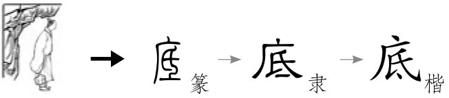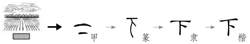 “下”字是一个指事字,其字形上部为一长弯横,代表位于远方,并不是很平直的地平线;下部一短平横,指代地球上的各种事物。两者相连,便构成了指示方向的“下”。这个甲骨字形,与汉字中的“二”有些相似,为了区分二者,小篆就在中间加上了一条河流,逐渐形成了现在的写法。