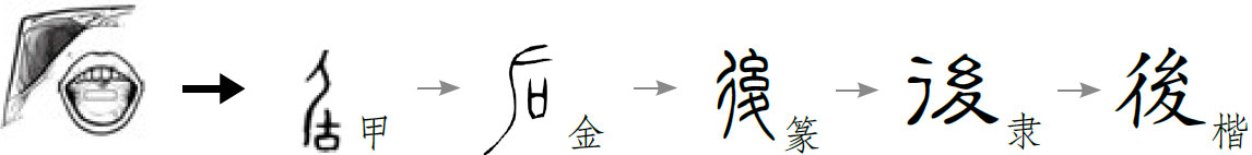 如今表示后来、后面含义的“后”字,其繁体字为“後”,从“彳”“幺”“攵”,本义是小孩子慢吞吞地走在后面,即迟到的意思,引申为后来、后面等;而“后”则是一个表示人张口发号施令的君王,其本意是君主、帝王,引申为皇后。王后的“后”和后来的“後”字,如今则统一用“后”。